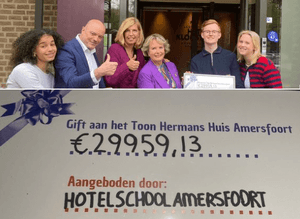 De general managers van de 4e jaars Manager Ondernemer Horeca klassen van de Hotelschool Amersfoort in Leerhotel Het Klooster overhandigden, in bijzijn van hun horecadocent Gerjo Buma, een mooie waardecheque aan Carolien van der Moolen-Driessen en Monique Janssen van het Toon Hermans Huis Amersfoort, ons centrum voor leven met en na kanker.